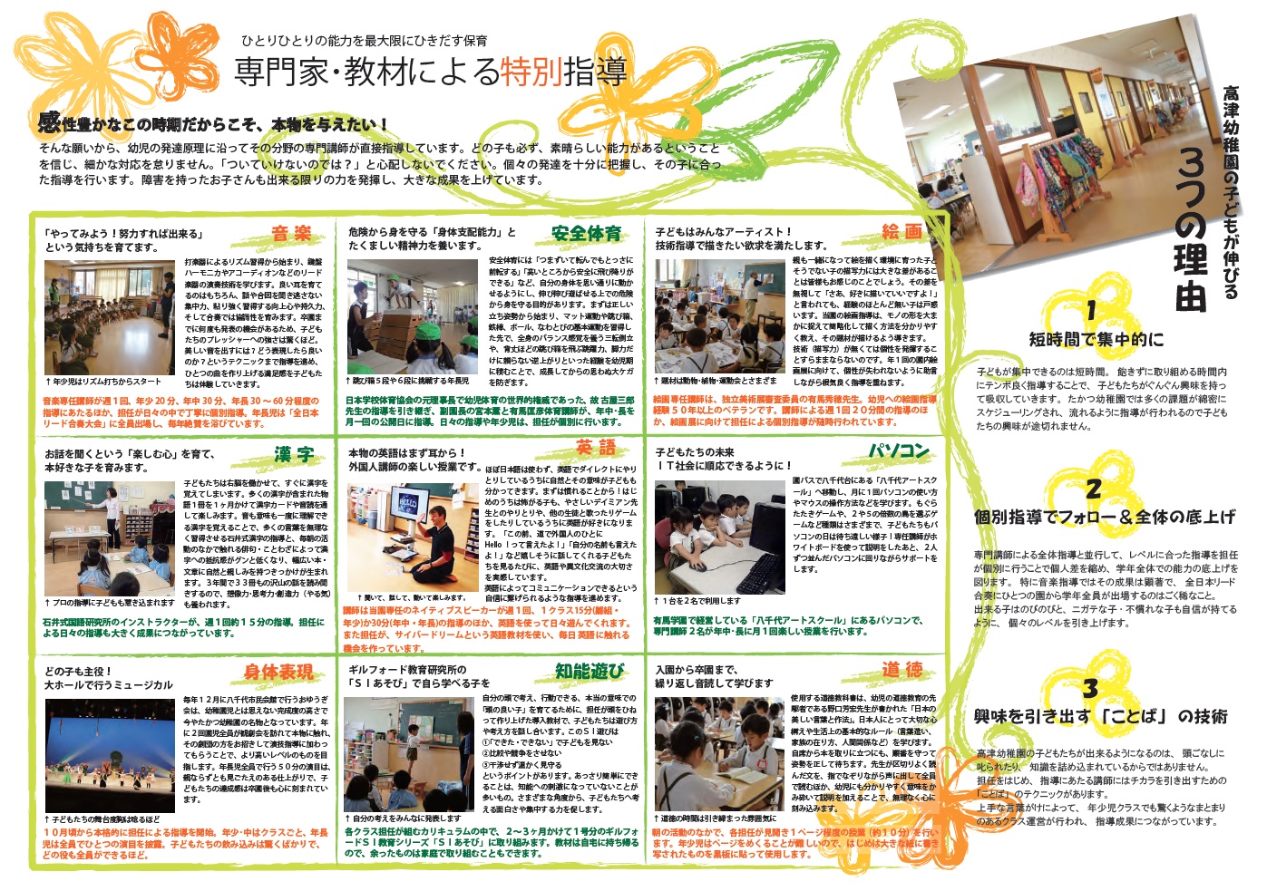 幼児の能力を最大限に引き出す為の特別保育を、発達の原理に沿って、各分野の世界の権威の先生をはじめとする専門の講師の直接指導によって行っています。